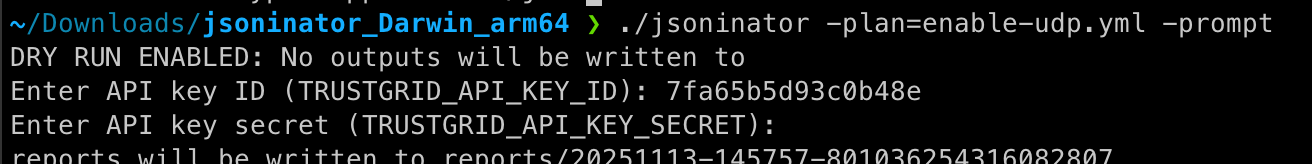 You can run JSONinator with the -prompt flag to securely enter your Trustgrid API key ID and SECRET at runtime: